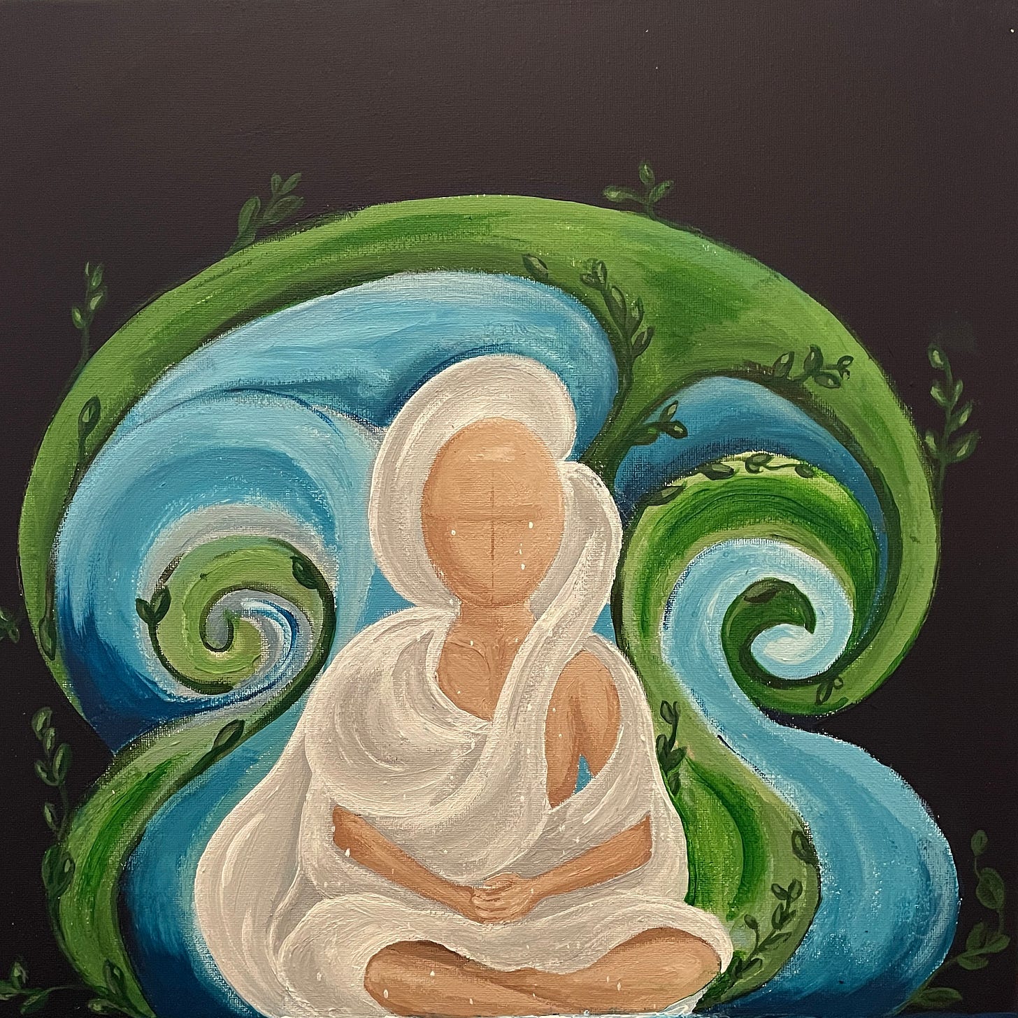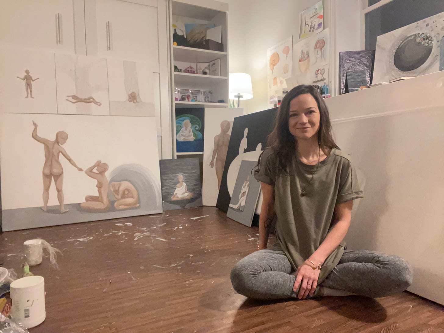 Painting for me is loving myself. The process of studying my own body and realizing how beautiful it is to have carried me through but that is just a body. Like every other human body, it contains a soul that is so much more than the body it is held in. To love on your physical form with tender care leads way into a relationship only you can understand. Your journey of soul, your body’s journey. The love of one can feed off the love of the other. The love for my child self and all her wounds were the discussions that led to the relationship with my soul self, the higher version of me. Although I do not consistently inhabit this higher version of me, she now has the keys to guide me and pull me back into center so that I can act from a place of knowing instead of doubt.